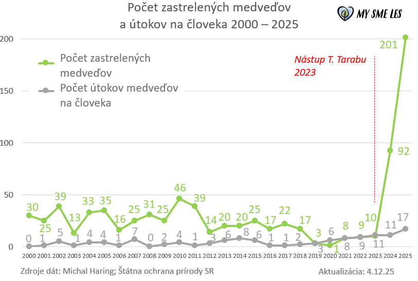 Na Slovensku prebieha masívne zabíjanie medveďov, ktoré podľa odborníkov ani dostupných dát nezvyšuje bezpečnosť ľudí. Zásahy sa vo väčšine prípadov zameriavajú na náhodné medvede, nie na jedince so skutočne rizikovým správaním. Napriek zastreleniu neuveriteľných 300 medveďov len za dva roky evidujeme nárast počtu útokov.